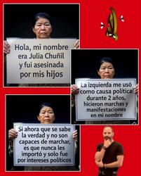Sin embargo, la fiscal regional de Los Ríos, Tatiana Esquivel, fue clara al señalar que no existen antecedentes que permitan sostener que Chuñil ejerciera una labor activista organizada, describiéndola más bien como una mujer dedicada a la vida rural y familiar.